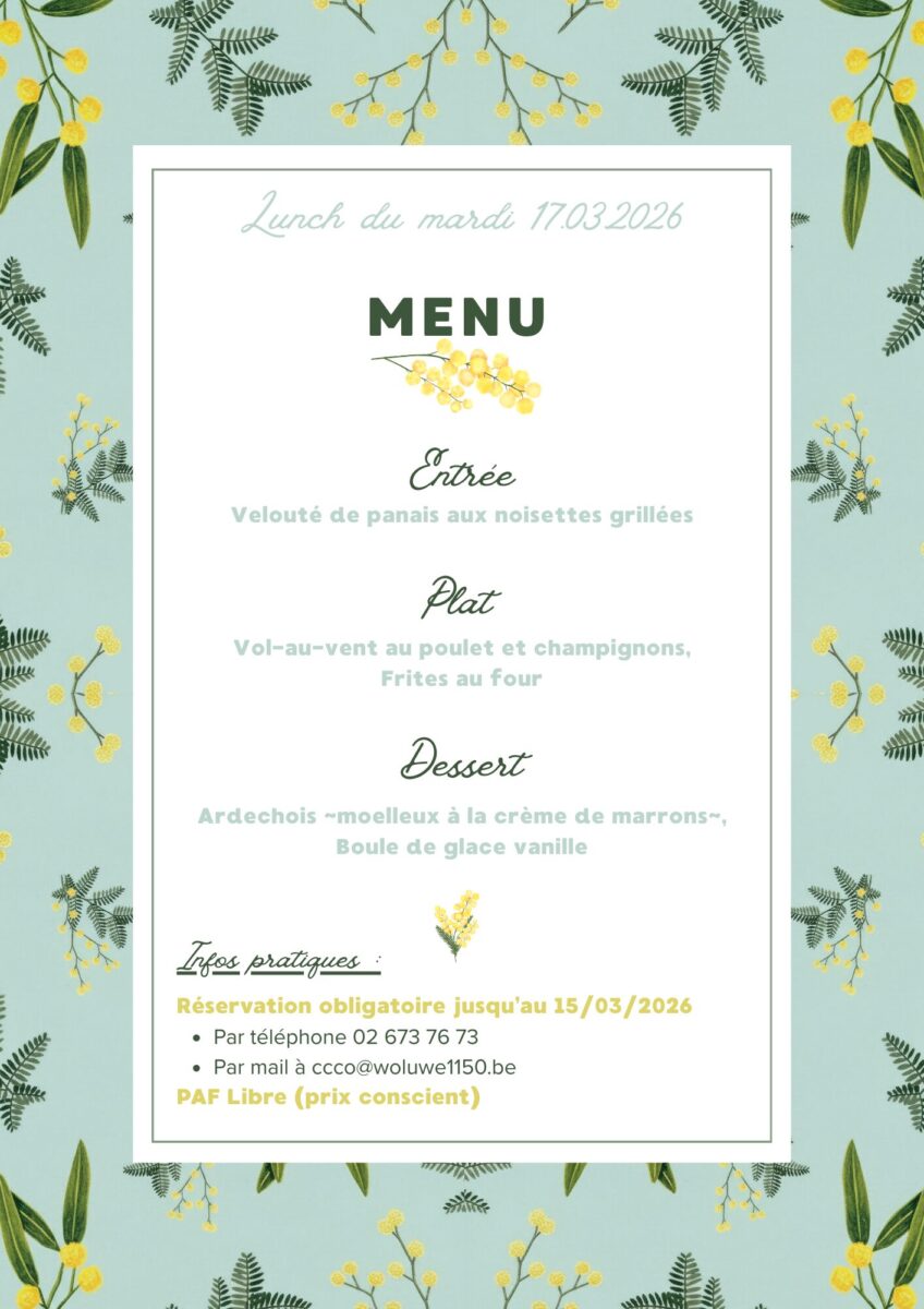 Le prochain repas du CCCO, préparé et servi par la formidable équipe de l’asbl Vivre & Grandir, aura lieu le mardi 17 mars, de 12h à 14h.